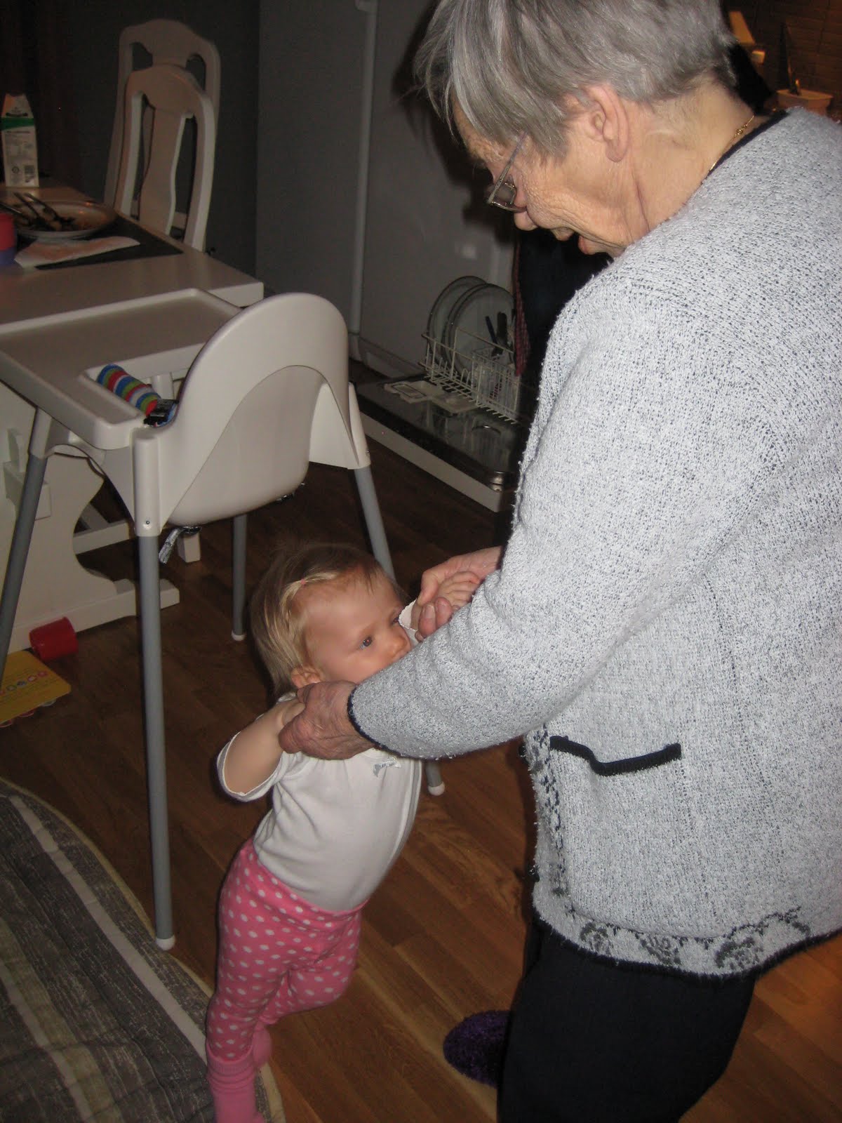 Klara har en ny favoritlek! Att man springer fort med henne fram och tillbaka! Detta gjorde bus-moster med henne förut och hon ville bara göra om och om det heeeela tiden! Stackars moster blev som en ostbåge! ;) Så fort Helene satte ner henne på golvet så gnällde hon och klängde och ville göra om det, haha! Bus med moster är det roligaste som finns!
